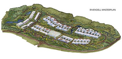 The masterplan shows clustered housing set amongst ample green open space, incorporating four concentric