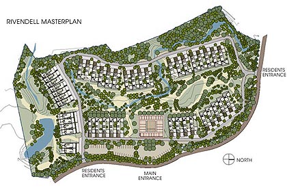 The masterplan shows clustered housing set amongst ample green open space, incorporating four concentric